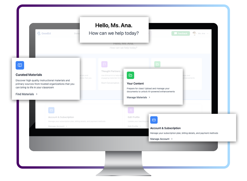 GoodEd.ai helps draft differentiated materials, discussion prompts, local examples, and more—all editable, all sourced.