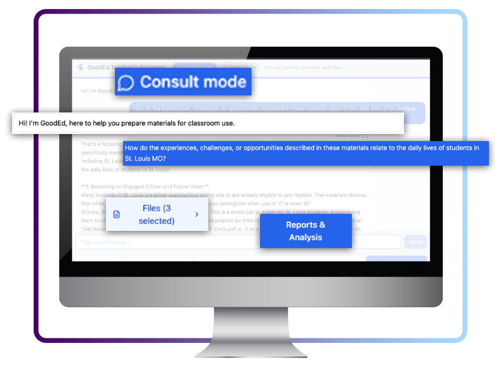 GoodEd.ai helps you adapt trusted iCivics lessons for your students, adding scaffolds, supports, and local connections that make learning engaging for each and every learner.