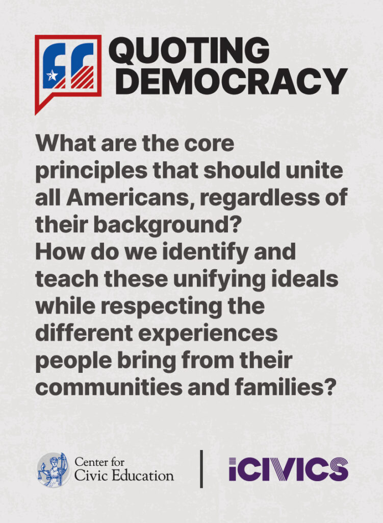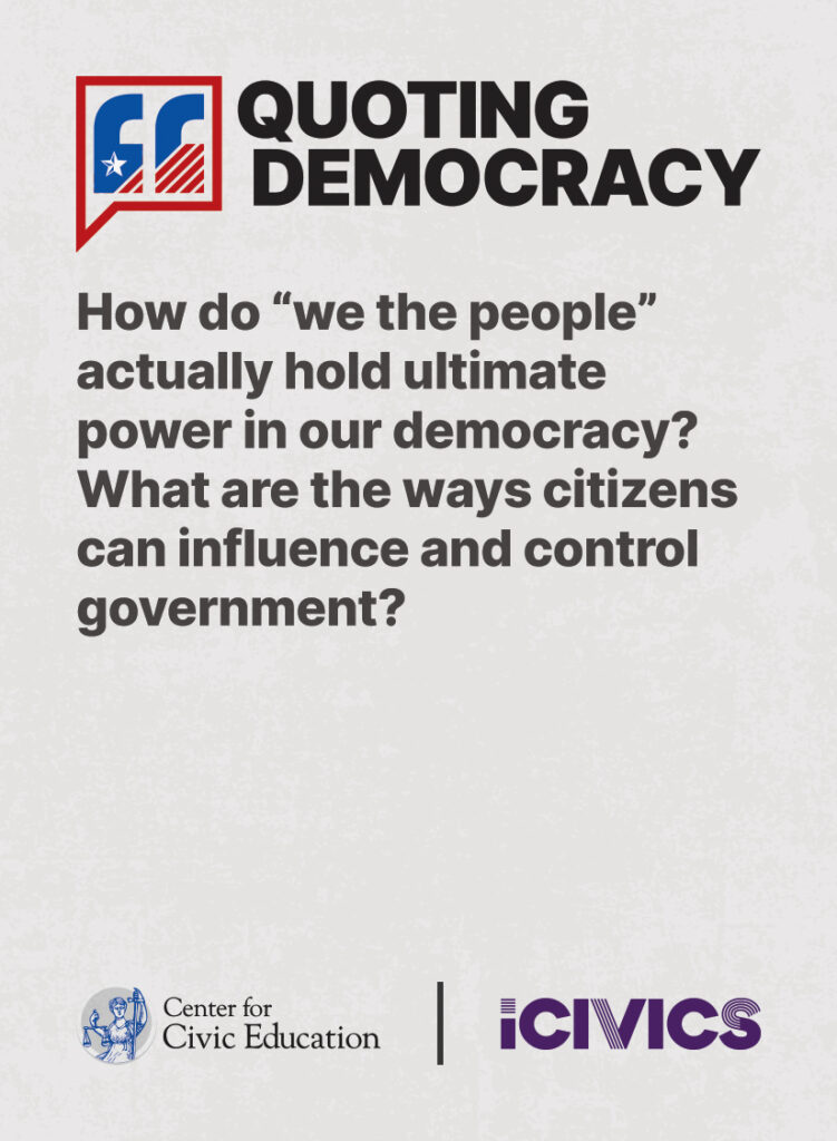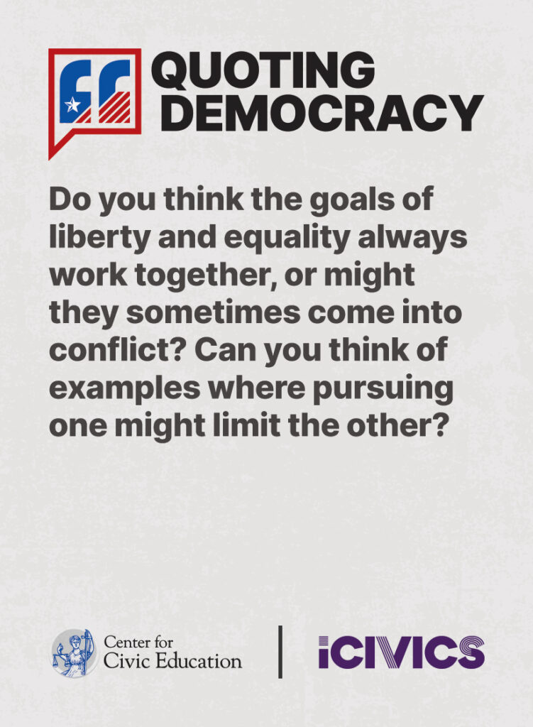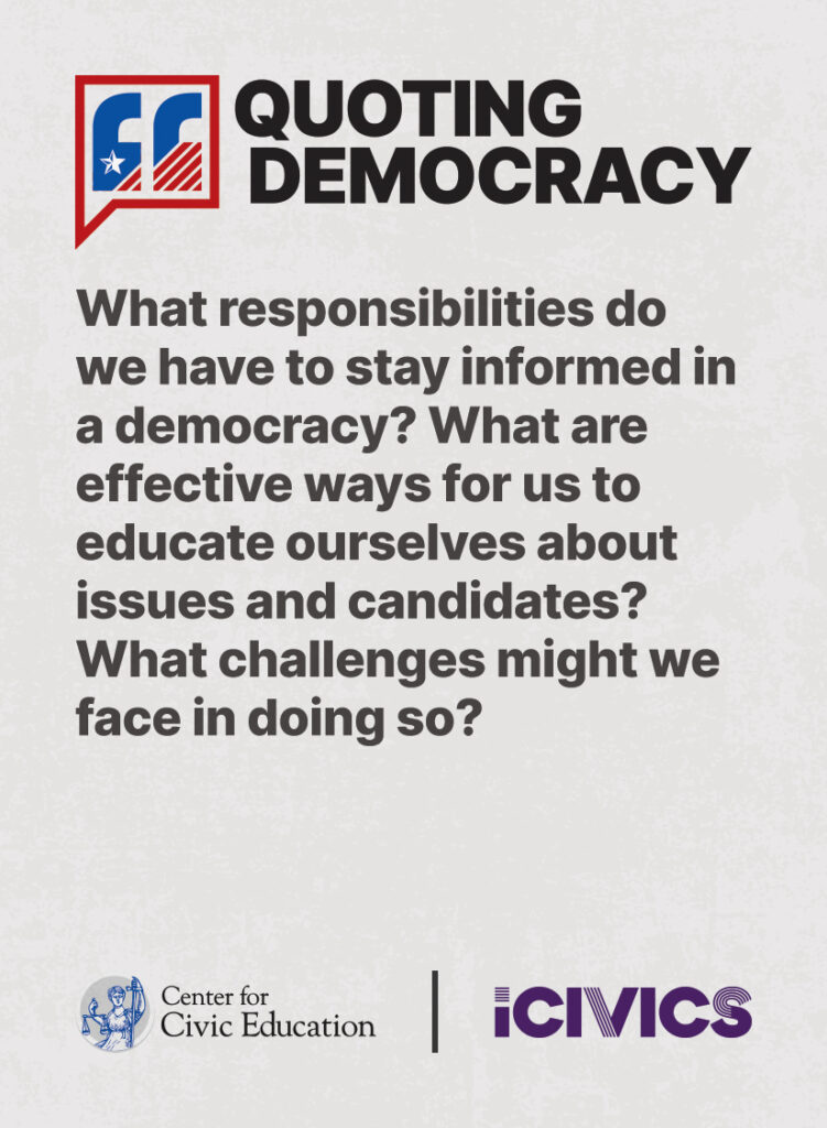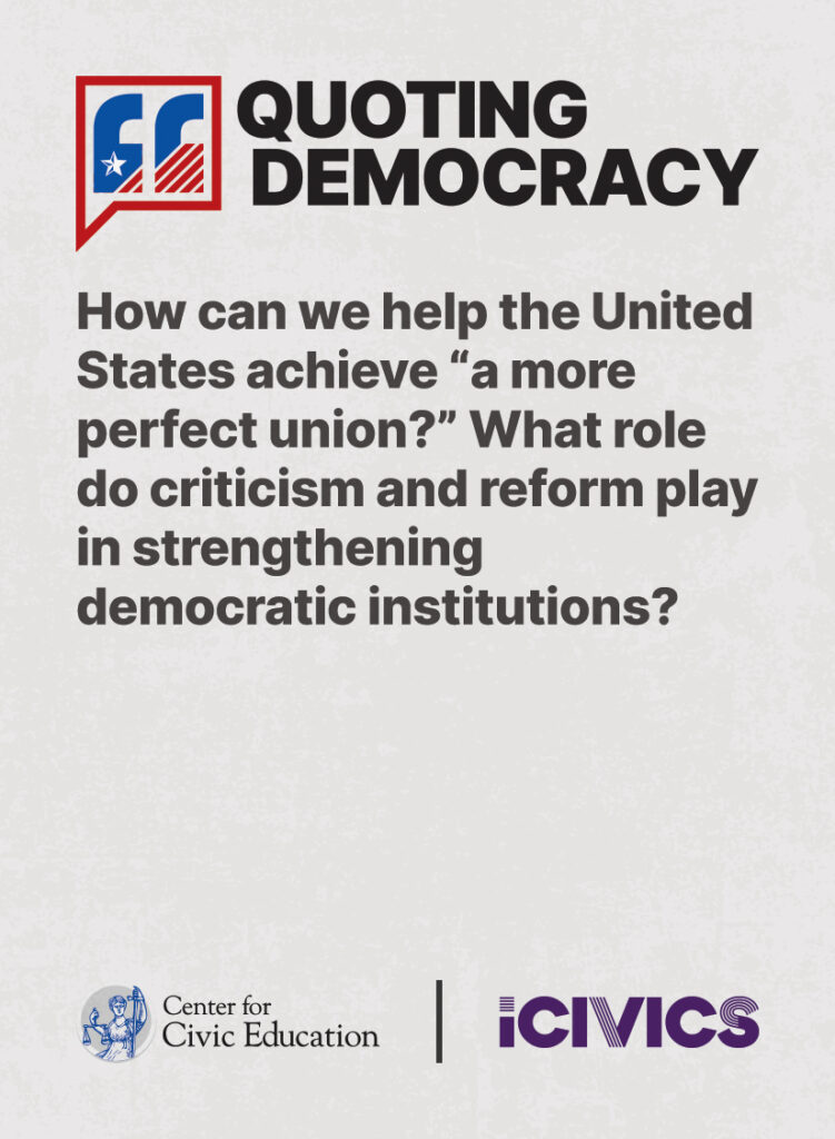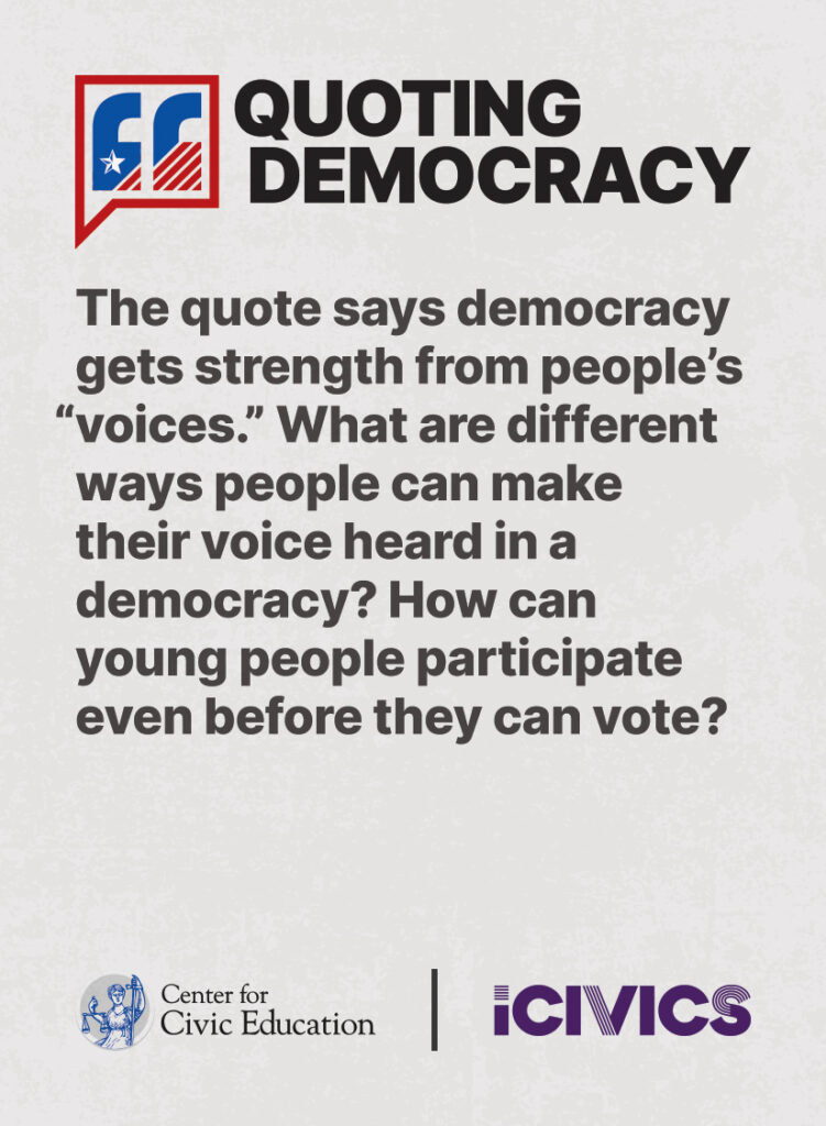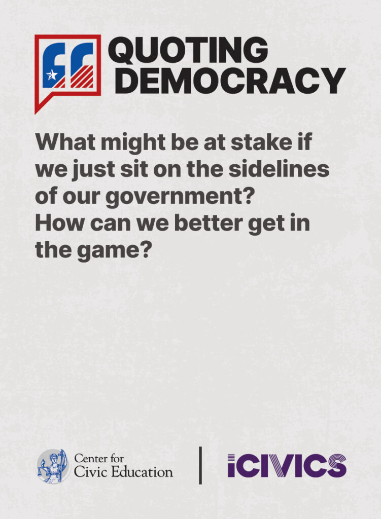 Engage students in civic values and sharpen their critical thinking skills. Quoting Democracy, created by iCivics and the Center for Civic Education, introduces students to quotes from iconic figures in American civics and prompts them to think deeply about the nation’s history and principles. Use the deck to boost your lesson plan or as a ready-to-use bellringer.