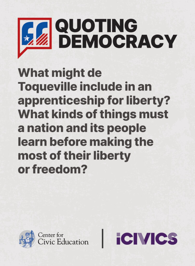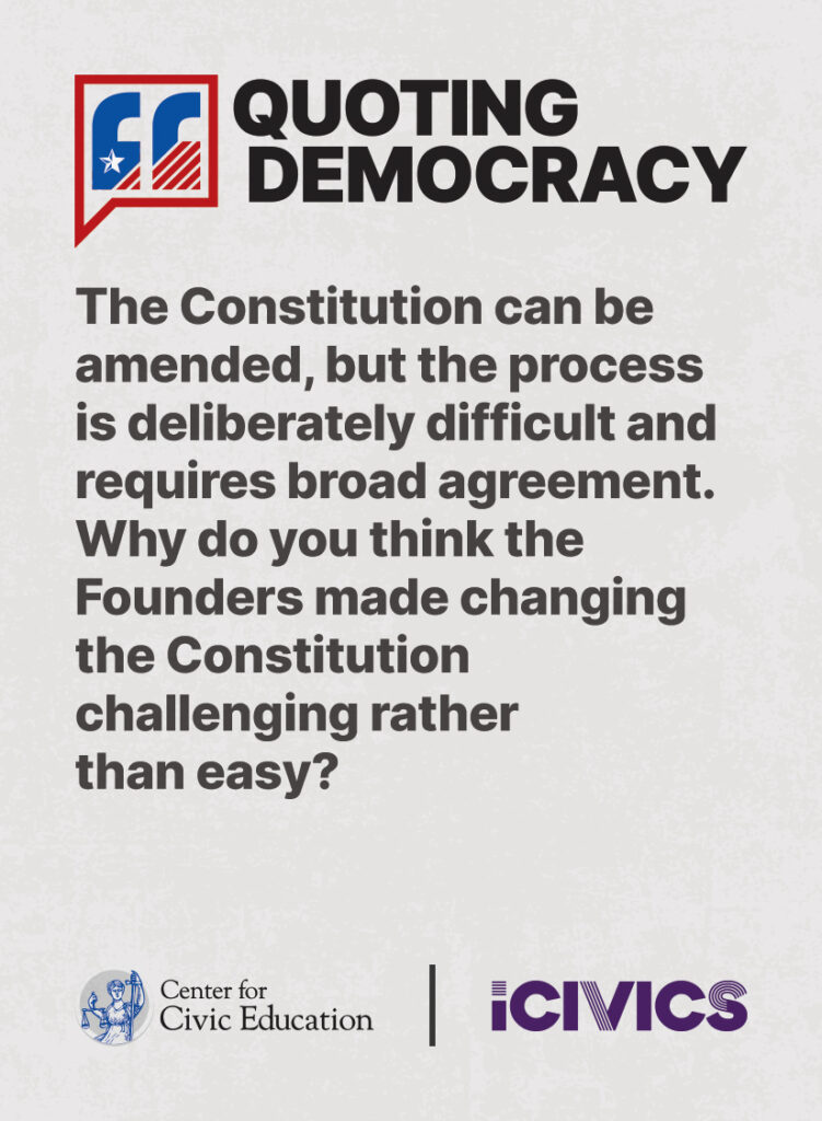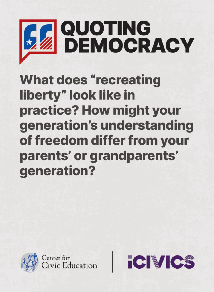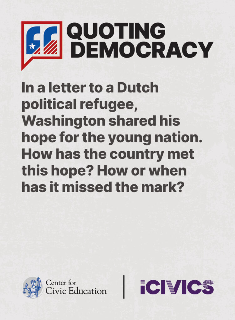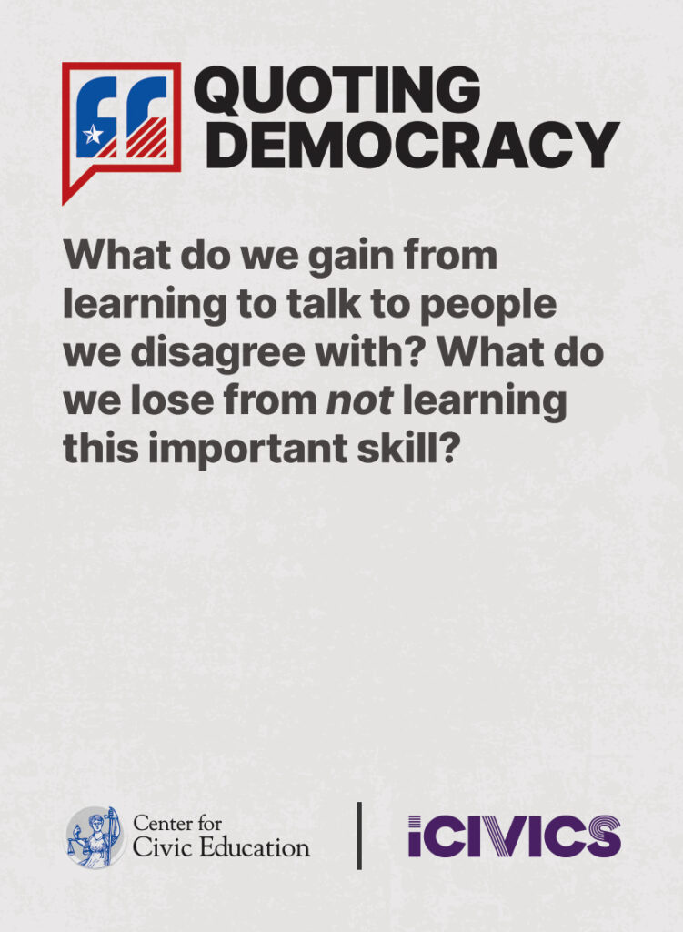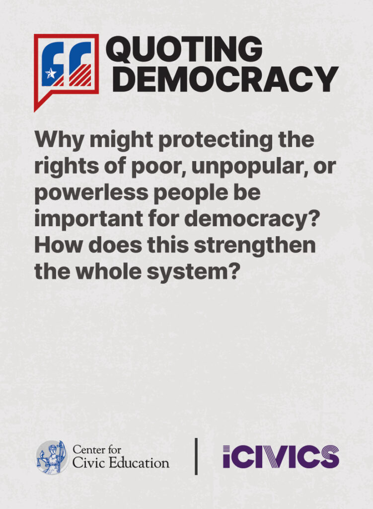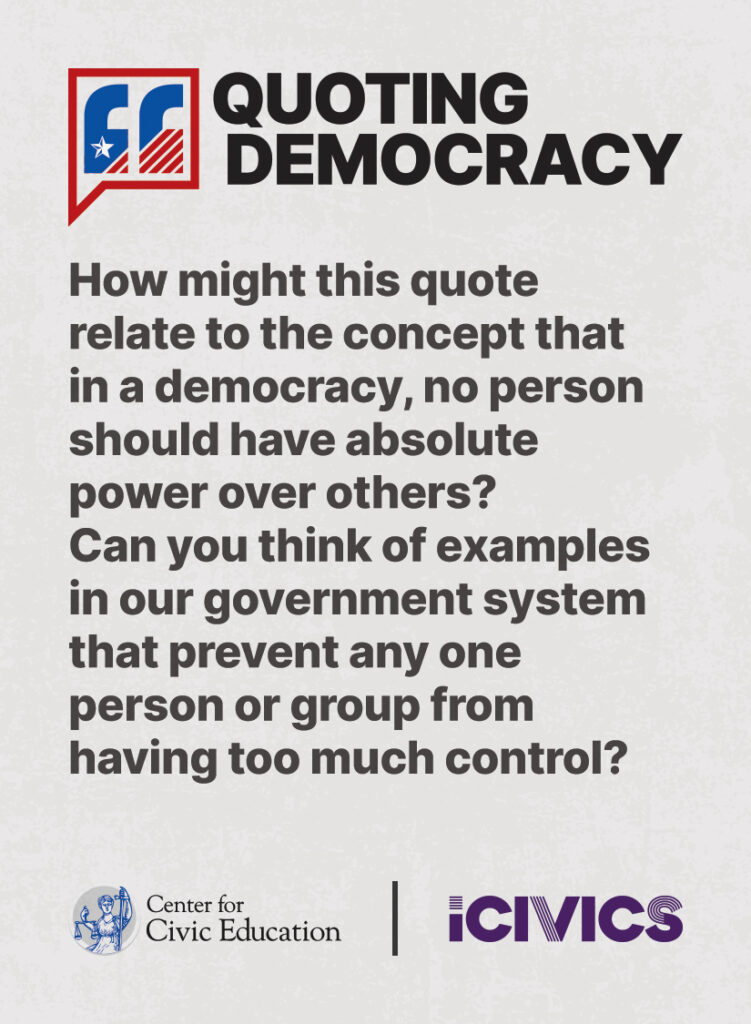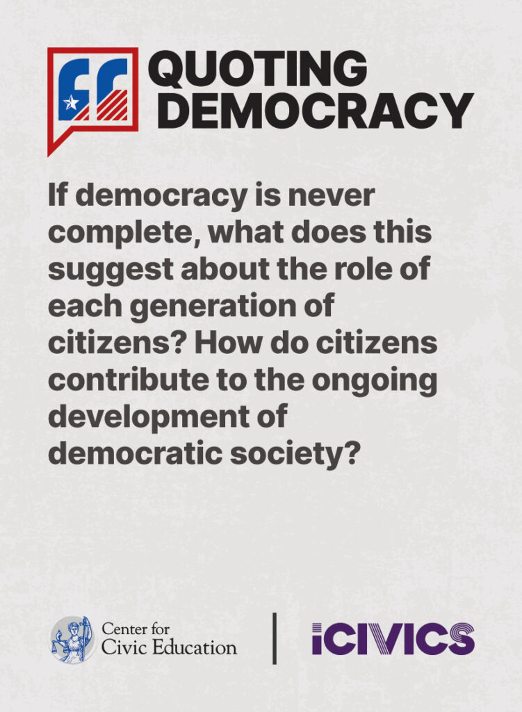 Engage students in civic values and sharpen their critical thinking skills. Quoting Democracy, created by iCivics and the Center for Civic Education, introduces students to quotes from iconic figures in American civics and prompts them to think deeply about the nation’s history and principles. Use the deck to boost your lesson plan or as a ready-to-use bellringer.
