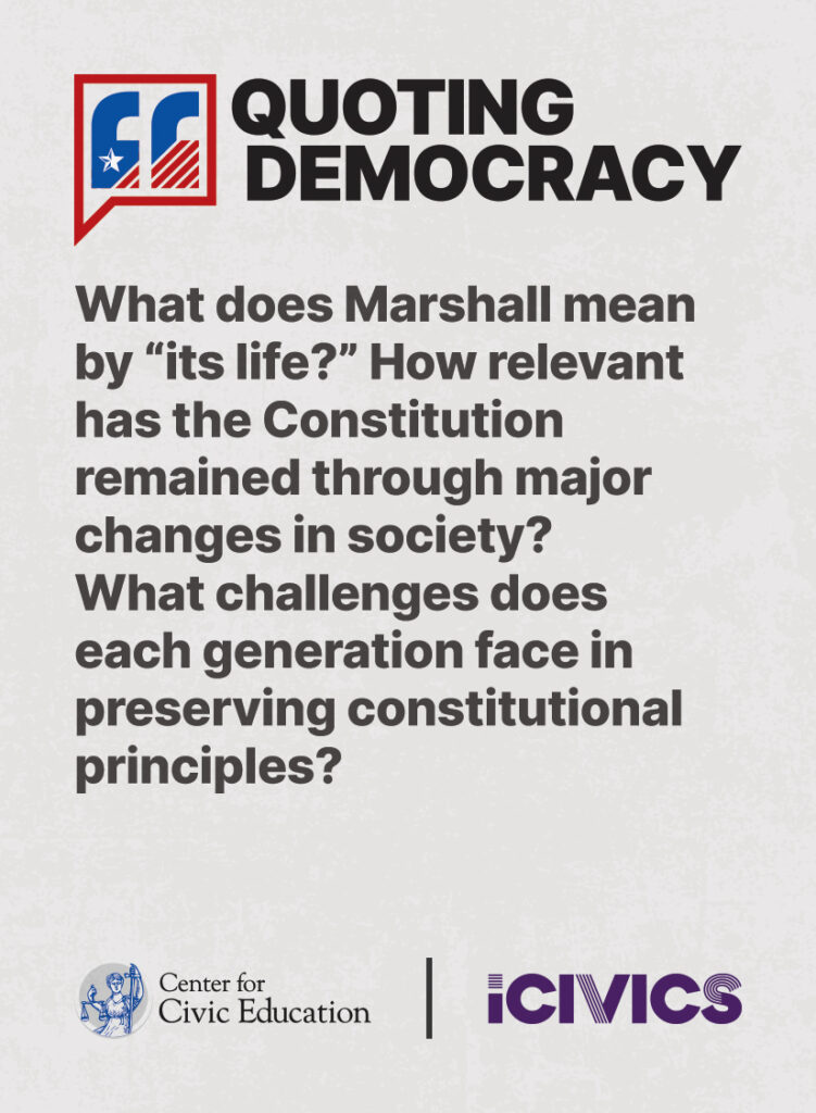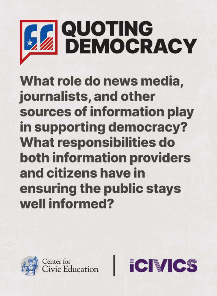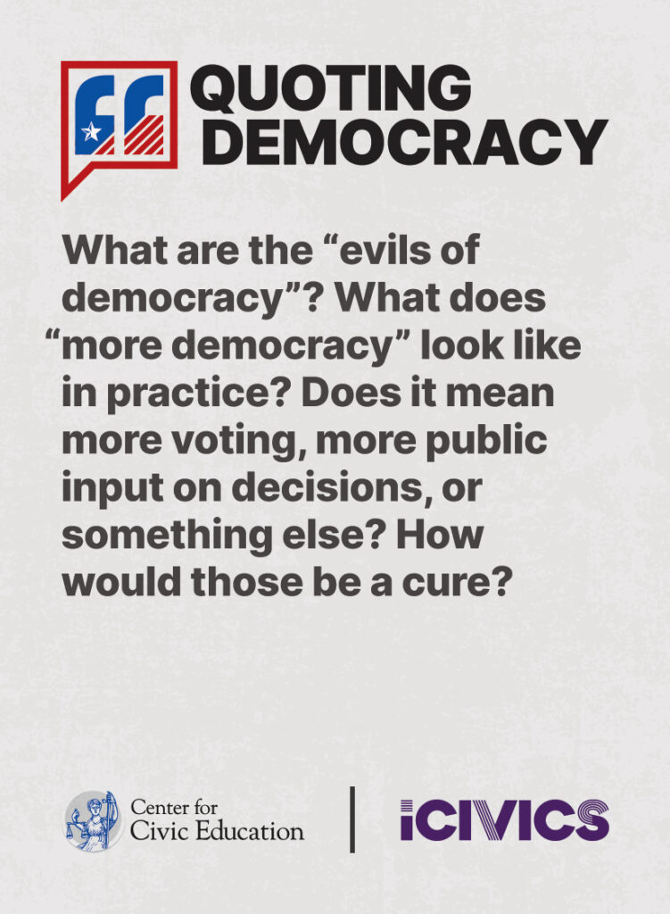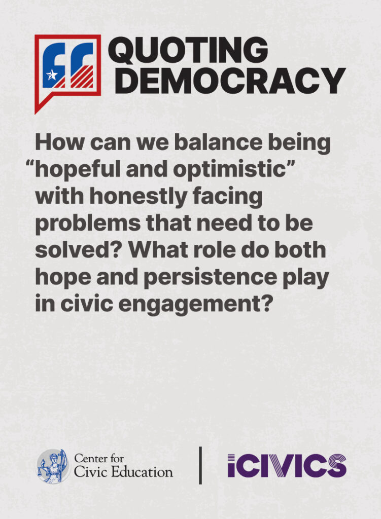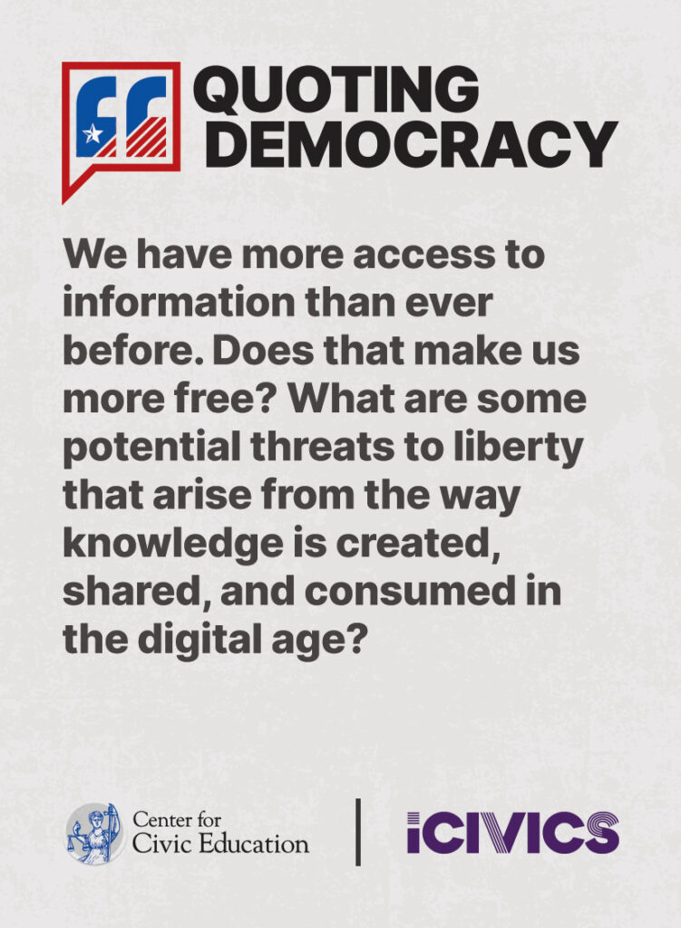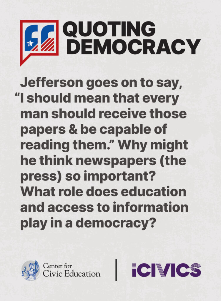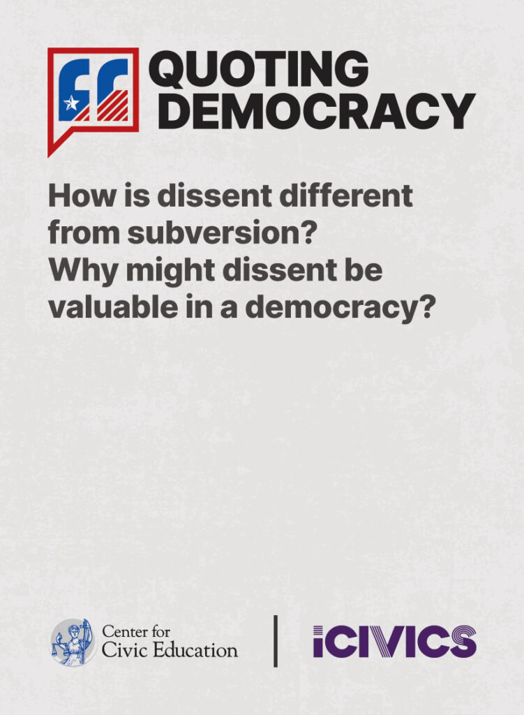 Engage students in civic values and sharpen their critical thinking skills. Quoting Democracy, created by iCivics and the Center for Civic Education, introduces students to quotes from iconic figures in American civics and prompts them to think deeply about the nation’s history and principles. Use the deck to boost your lesson plan or as a ready-to-use bellringer.