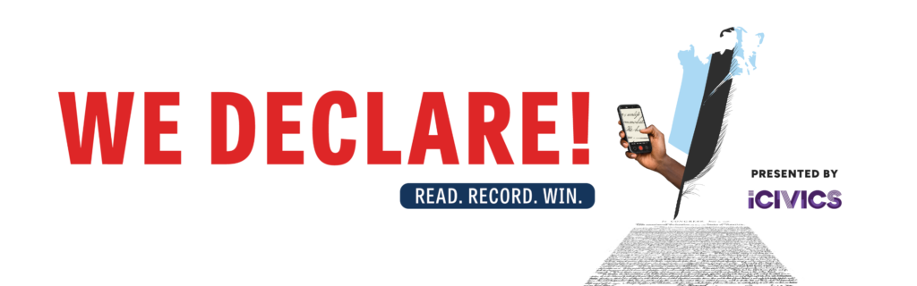 As the birthplace of the American Revolution, Massachusetts has a unique opportunity to mark the 250th anniversary of our nation’s founding with a bold, statewide civic event. iCivics invites every 8th grade student and educator in Massachusetts to take part in the We Declare! Challenge, a dynamic opportunity to perform a dramatic reading of the document that sparked it all: The Declaration of Independence.